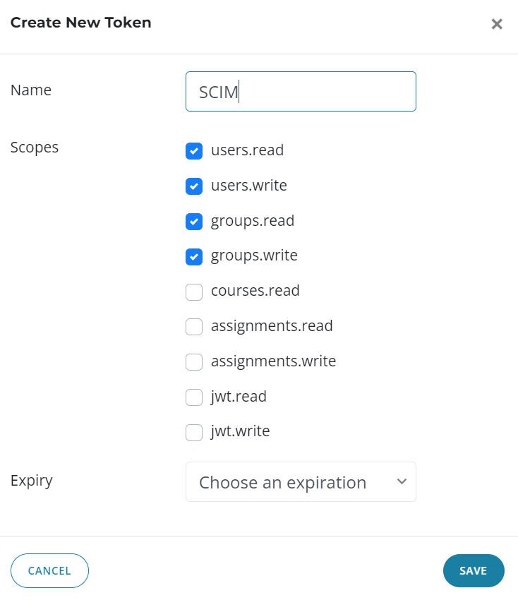 On your LMS portal click on Organisation > API Integrations and create a token with the permissions: users.read, users.write, groups.read and groups.write