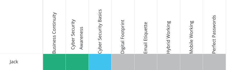 This will then produce a grid that looks something like this, however on yours there may be many more names of your users in a list. This shows quick diagram of the completion status of all the courses which are in a given assignment.