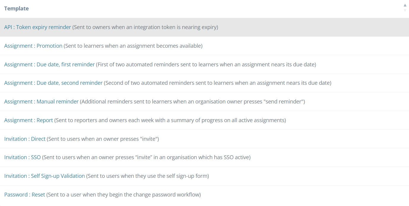 For example, the "Invitation Direct" template is used if you are manually adding users to the platform.