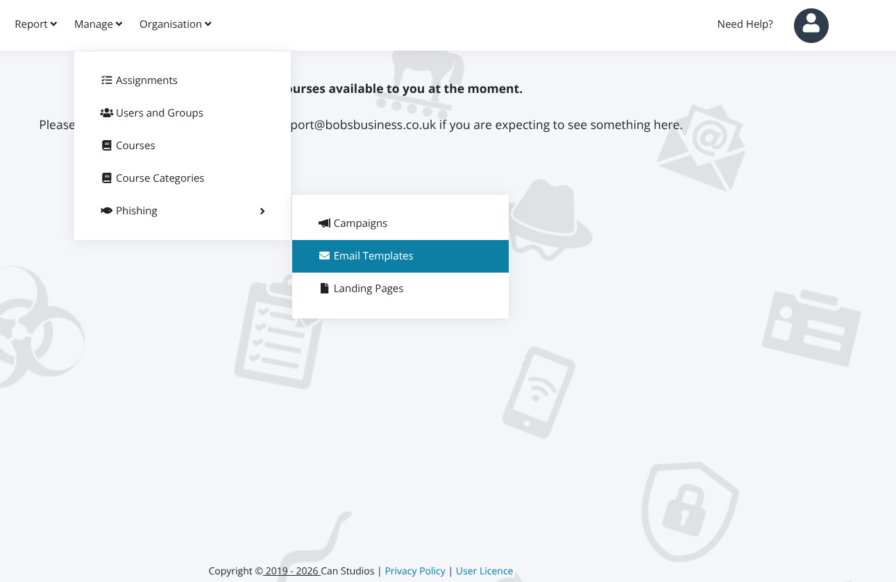 You must have admin access to be able to do this. Once you do, go to the Manage tab >> Phishing >> Email Templates.