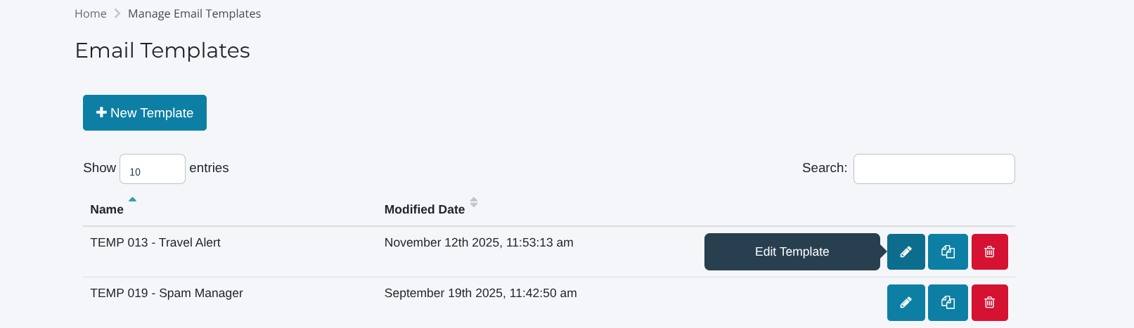 - From here, you can search for the template you would like to edit, and select the Blue Pencil Button titled 'Edit' on the right.